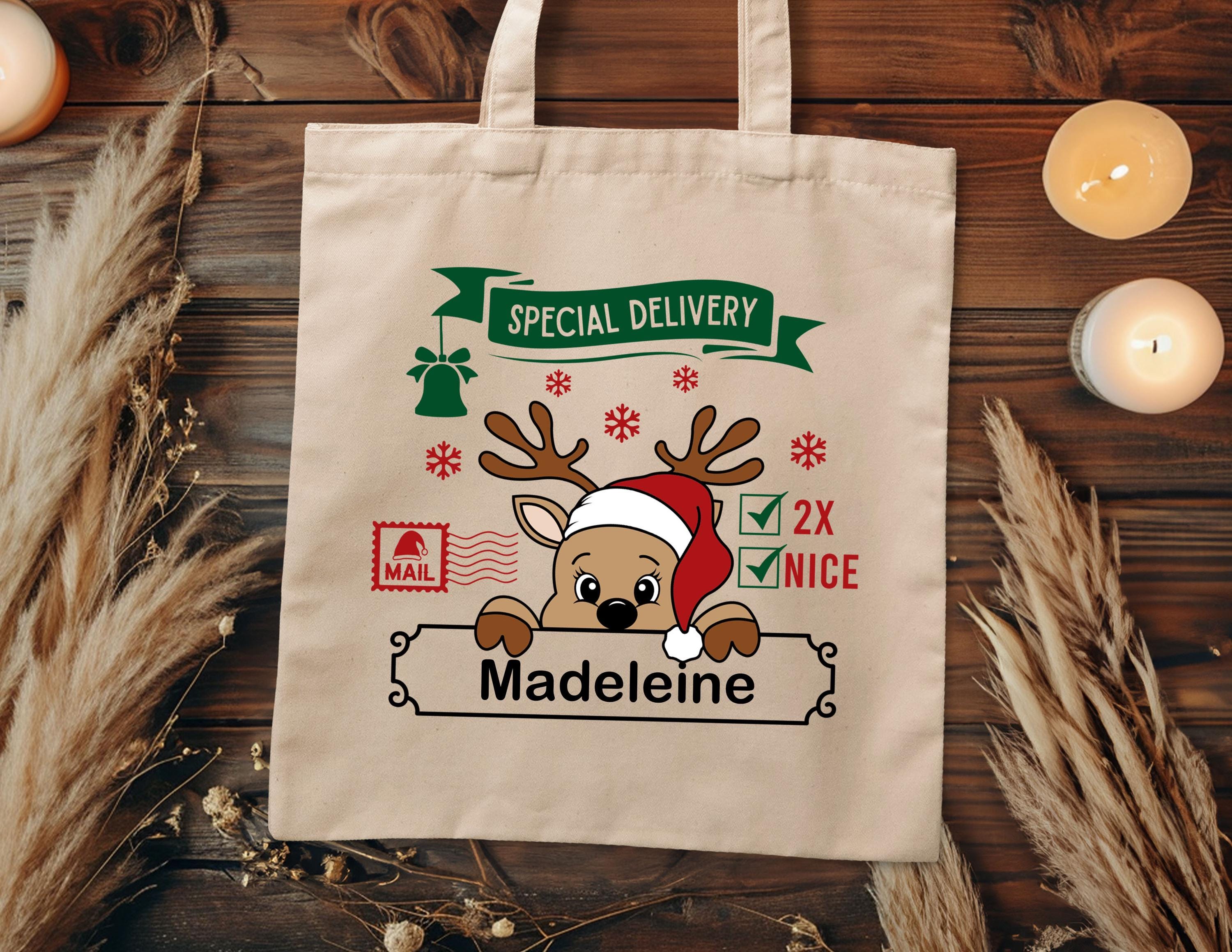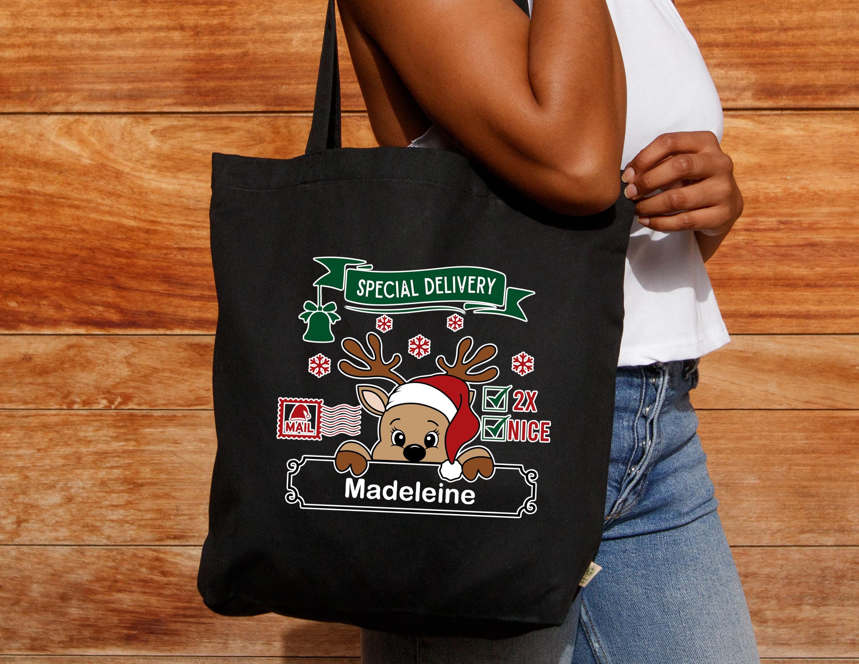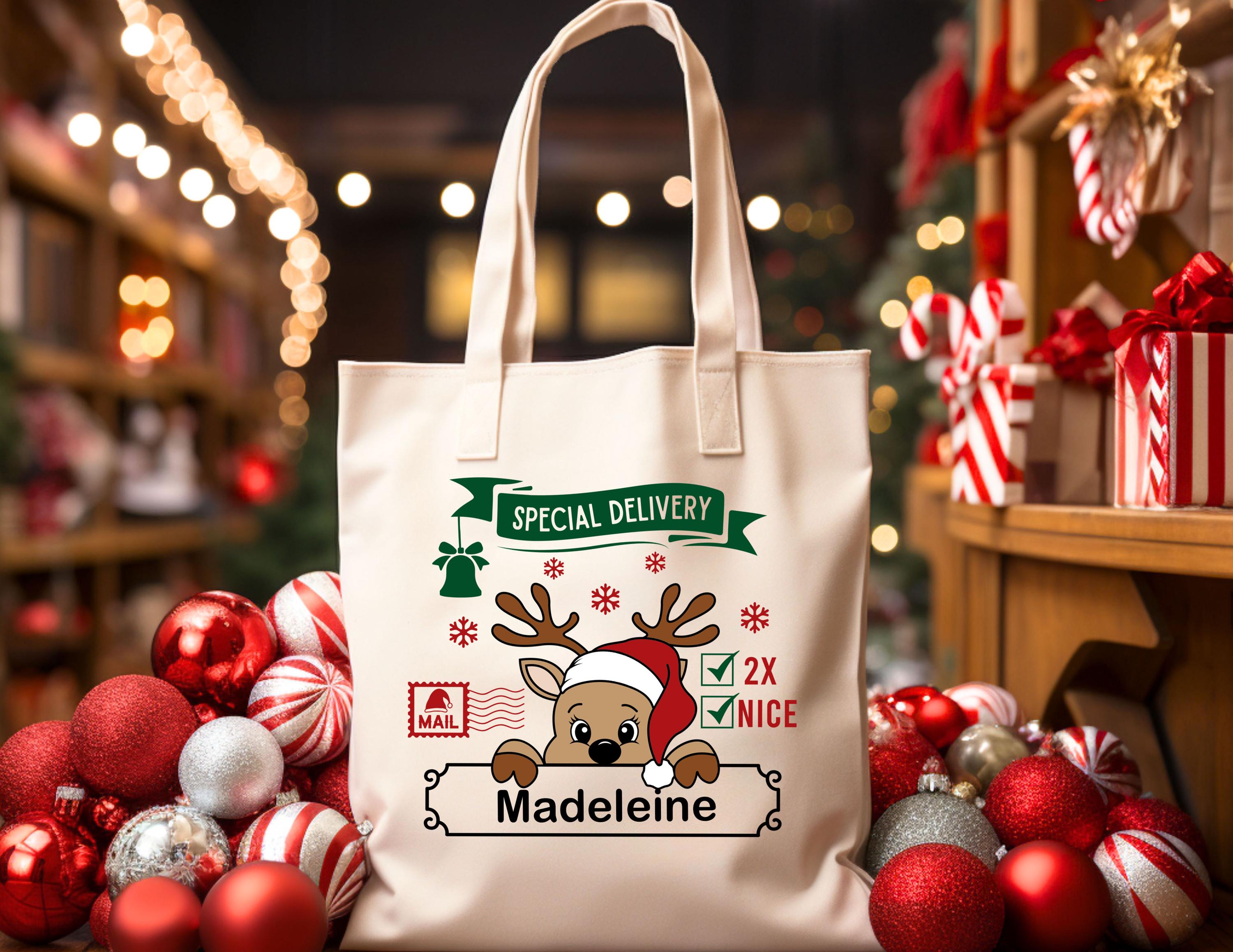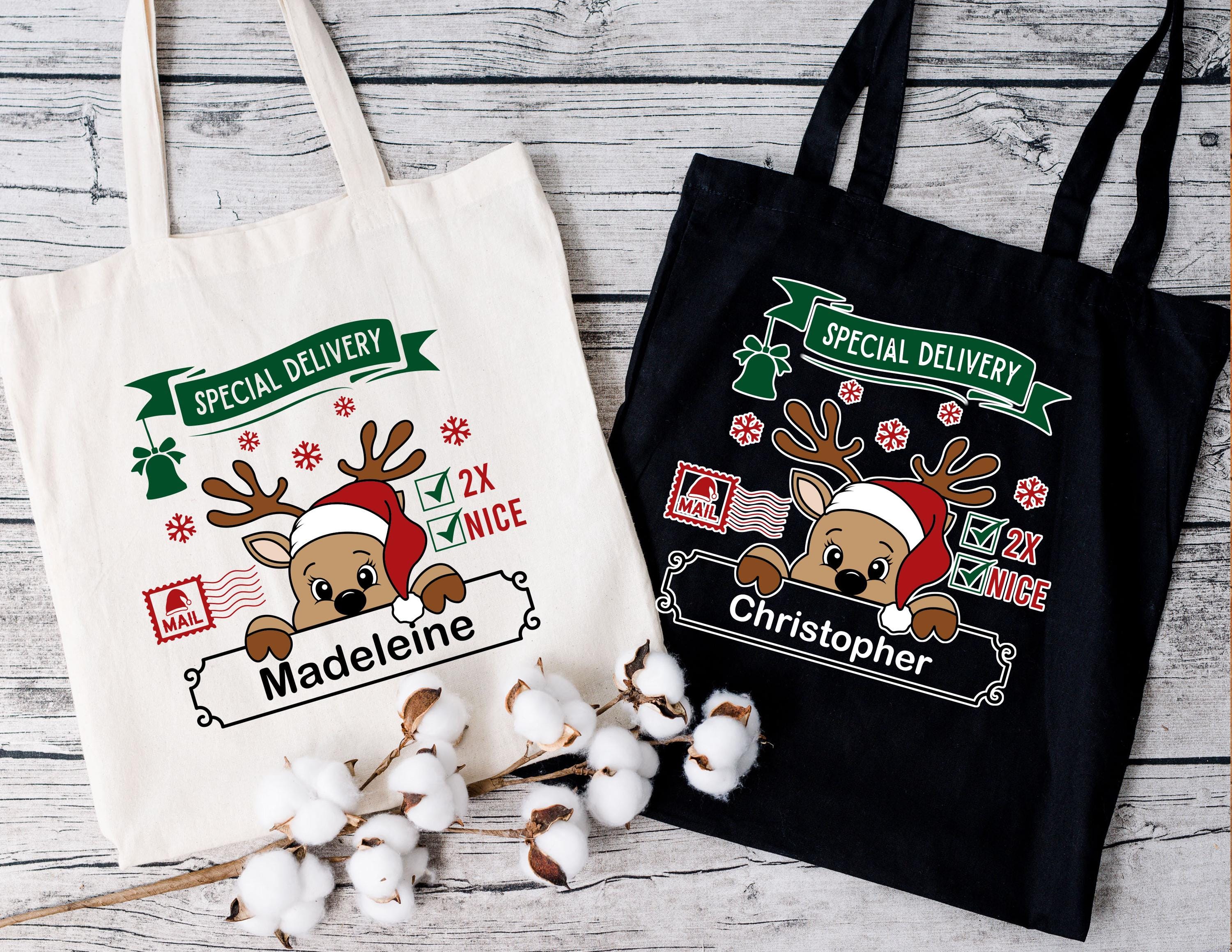 Elevate your holiday spirit with our charming Reindeer Tote Bag, the perfect eco-friendly companion for all your festive shopping needs. Designed with winter magic in mind, this reusable tote combines functionality and cute seasonal flair, making it an ideal Christmas gift for her—grab yours today and spread the holiday cheer! How To Order 1-) Please, check and review all photos 2-) Choose your bag color 3-) On the Personalization box you can add a note for any request. 4-) Click add to cart. You can go back to add more product, 5-) Click "Proceed to check out",
