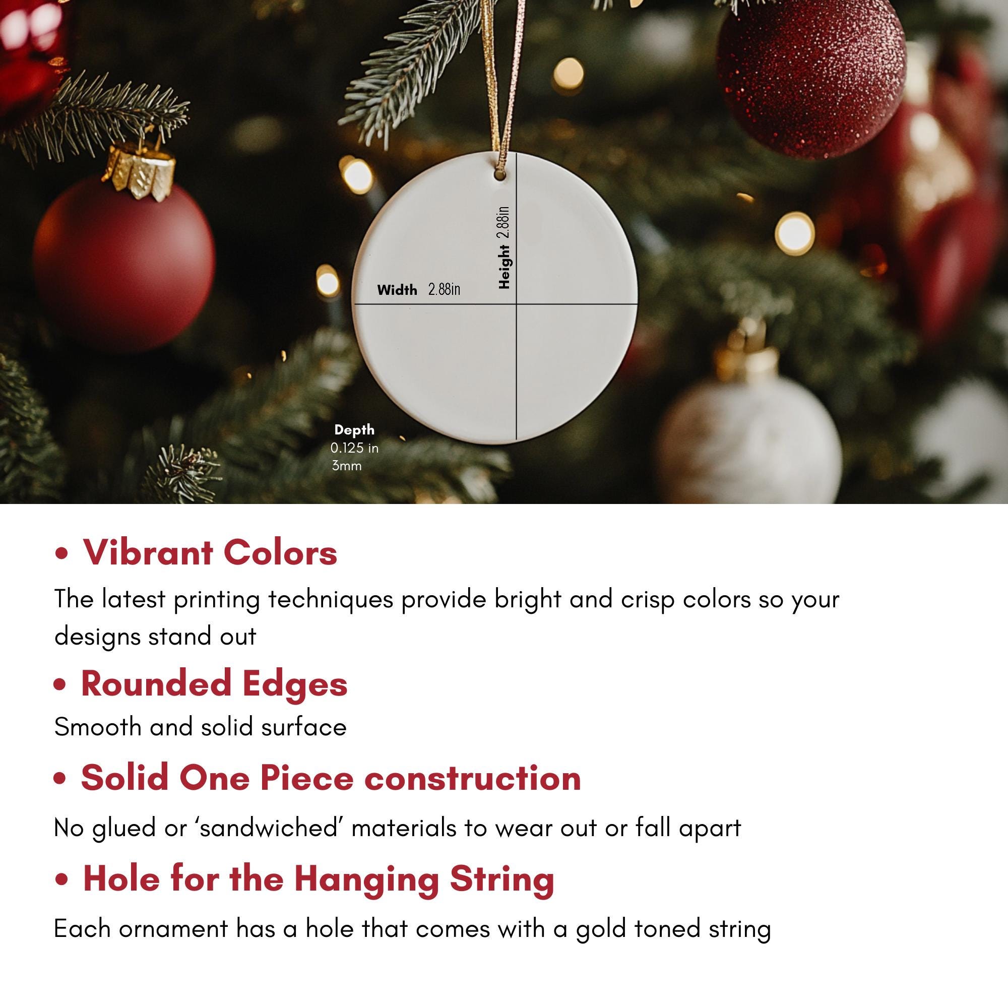 These Ornament are 2.88 inches and made of ceramic. Comes with golden string. They are individually hand printed using a sublimation process that seals the design creating a permanent image that will not peel, crack, nor fade.