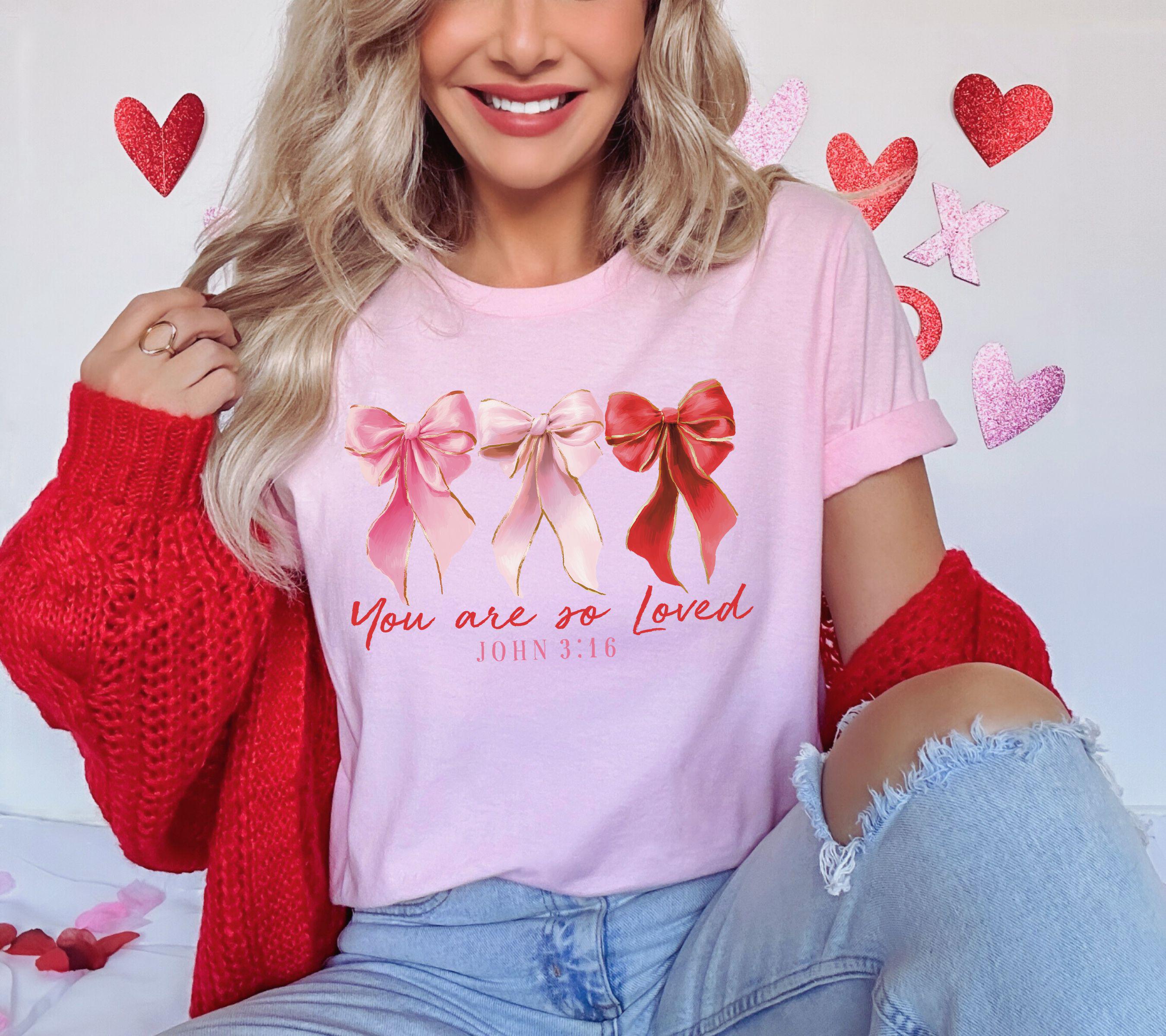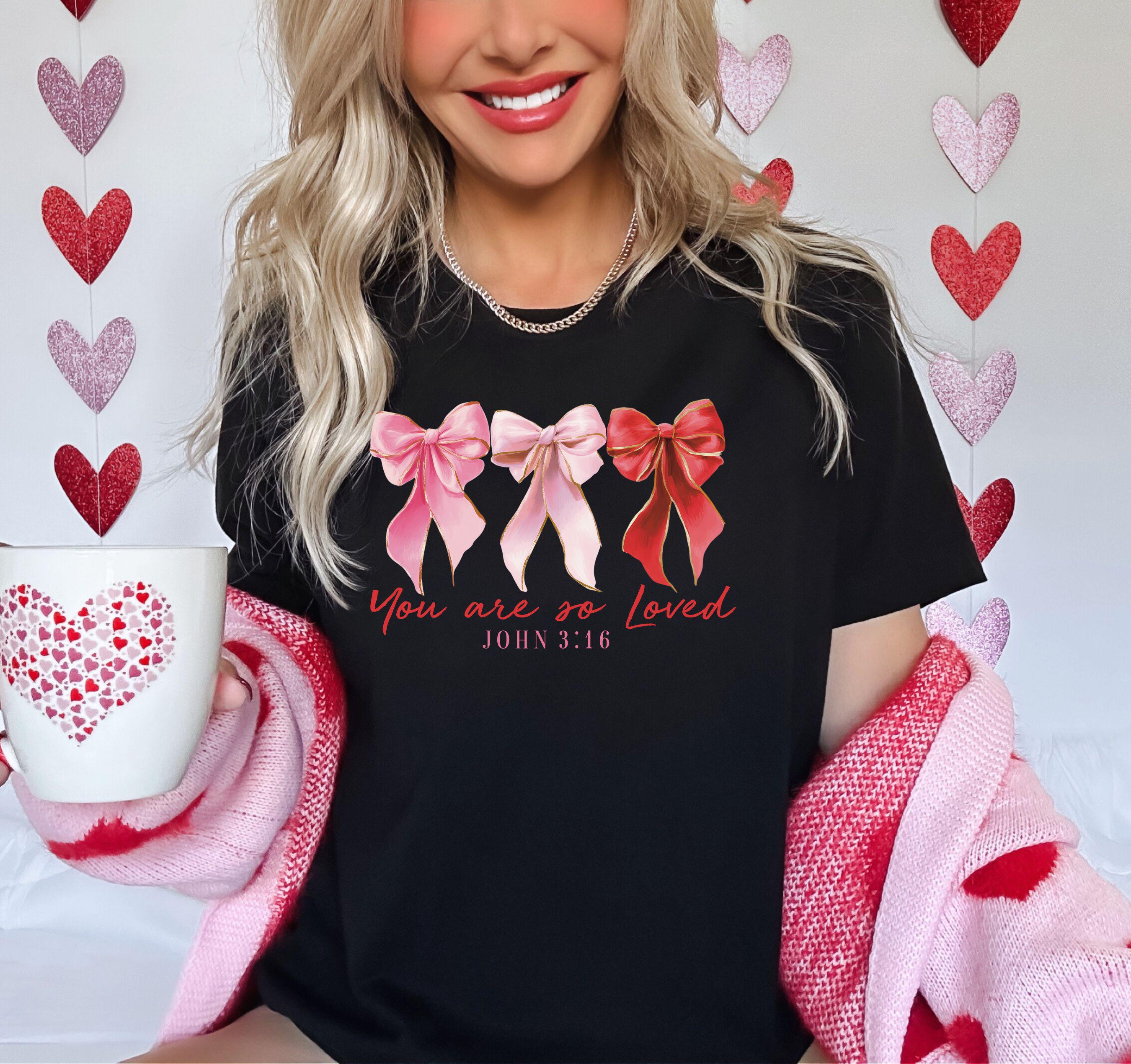 “You Are So Loved” inspirational message Cute bow detail for a feminine Valentine look Soft, comfortable fabric for everyday wear Easy to dress up or keep casual Makes a thoughtful Valentine’s Day gift
