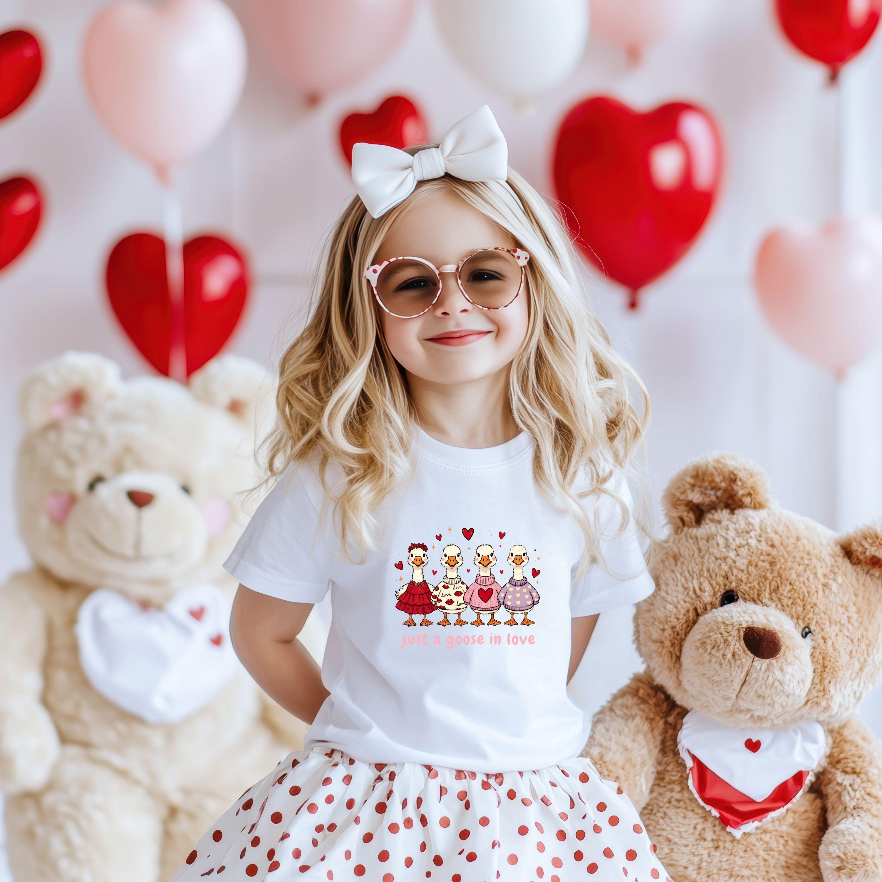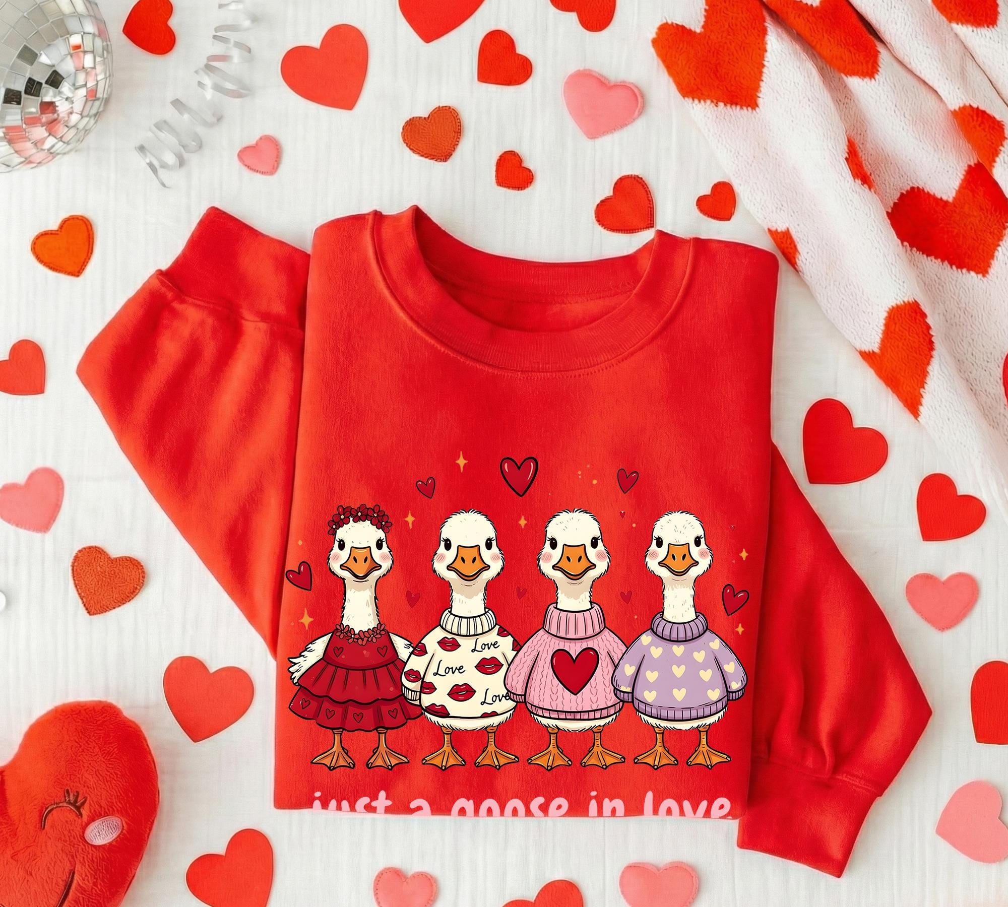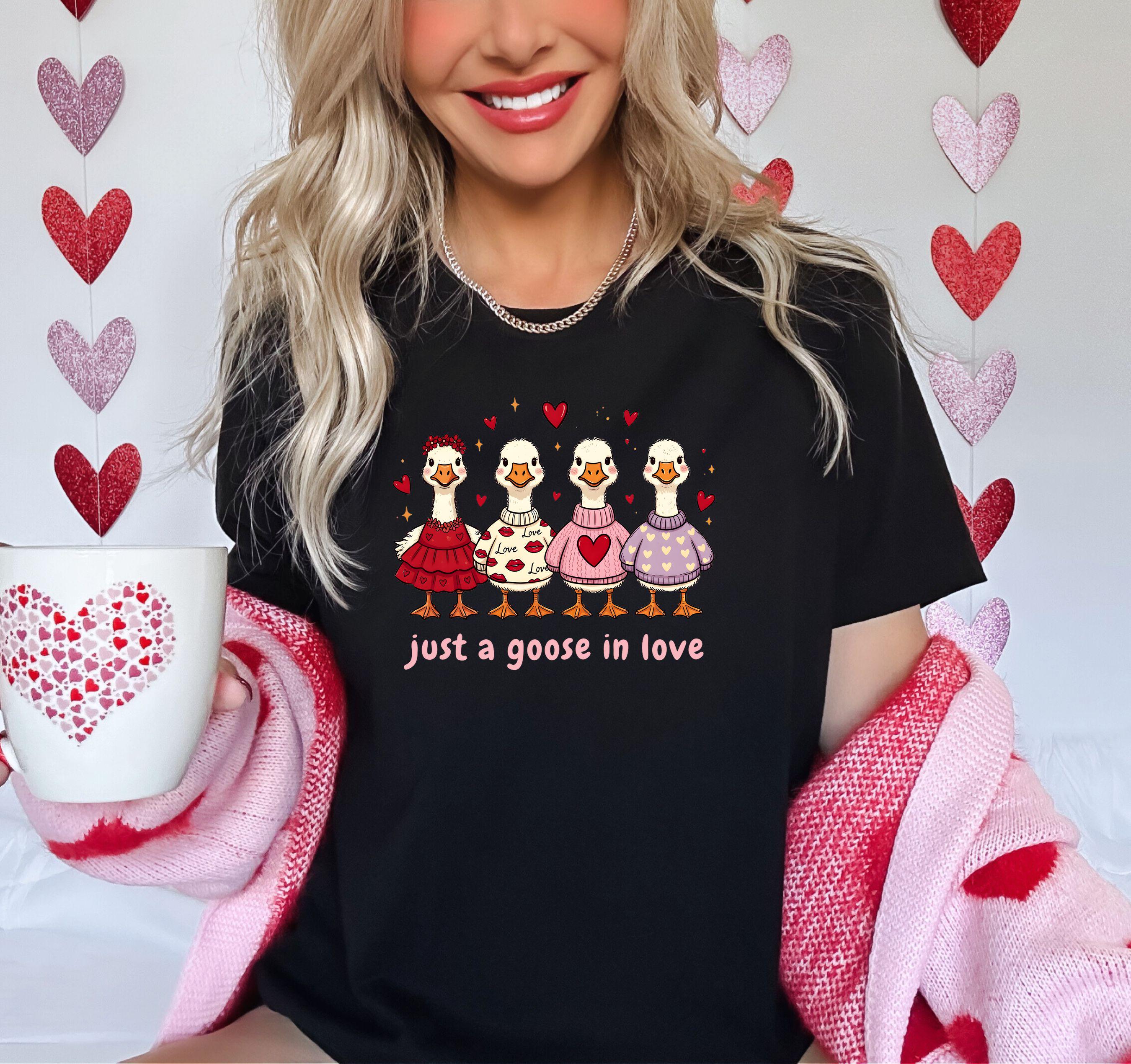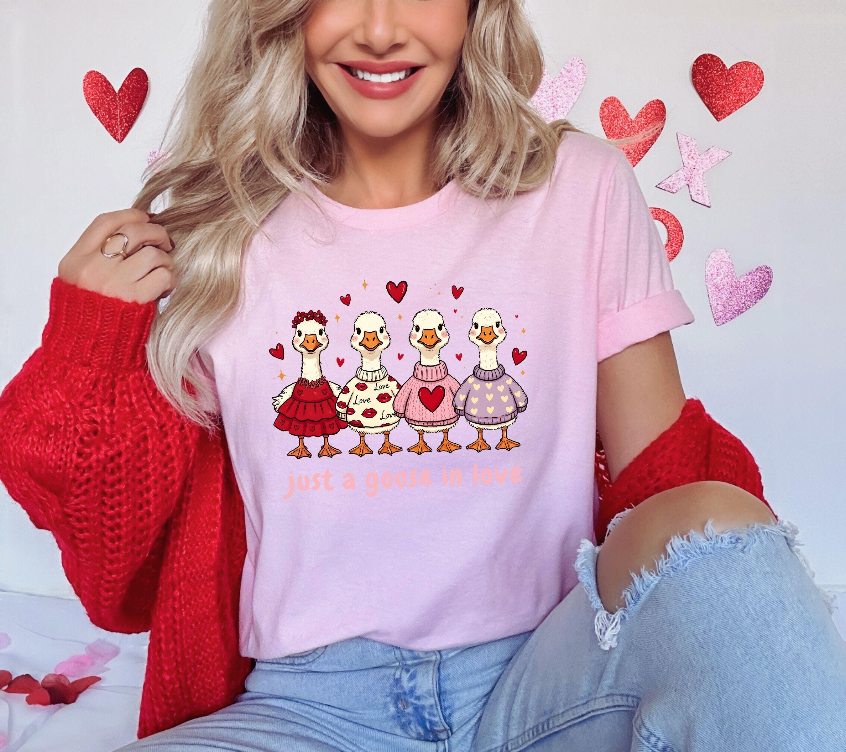 Add a touch of whimsy to your wardrobe with our "Just a Goose in Love" t-shirt. Featuring four adorable geese dressed in their Valentine's Day finest—complete with tiny sweaters and bows—this tee is perfect for teachers, moms, or little ones heading to school parties. It's a playful, festive look that brings a smile to everyone you meet.