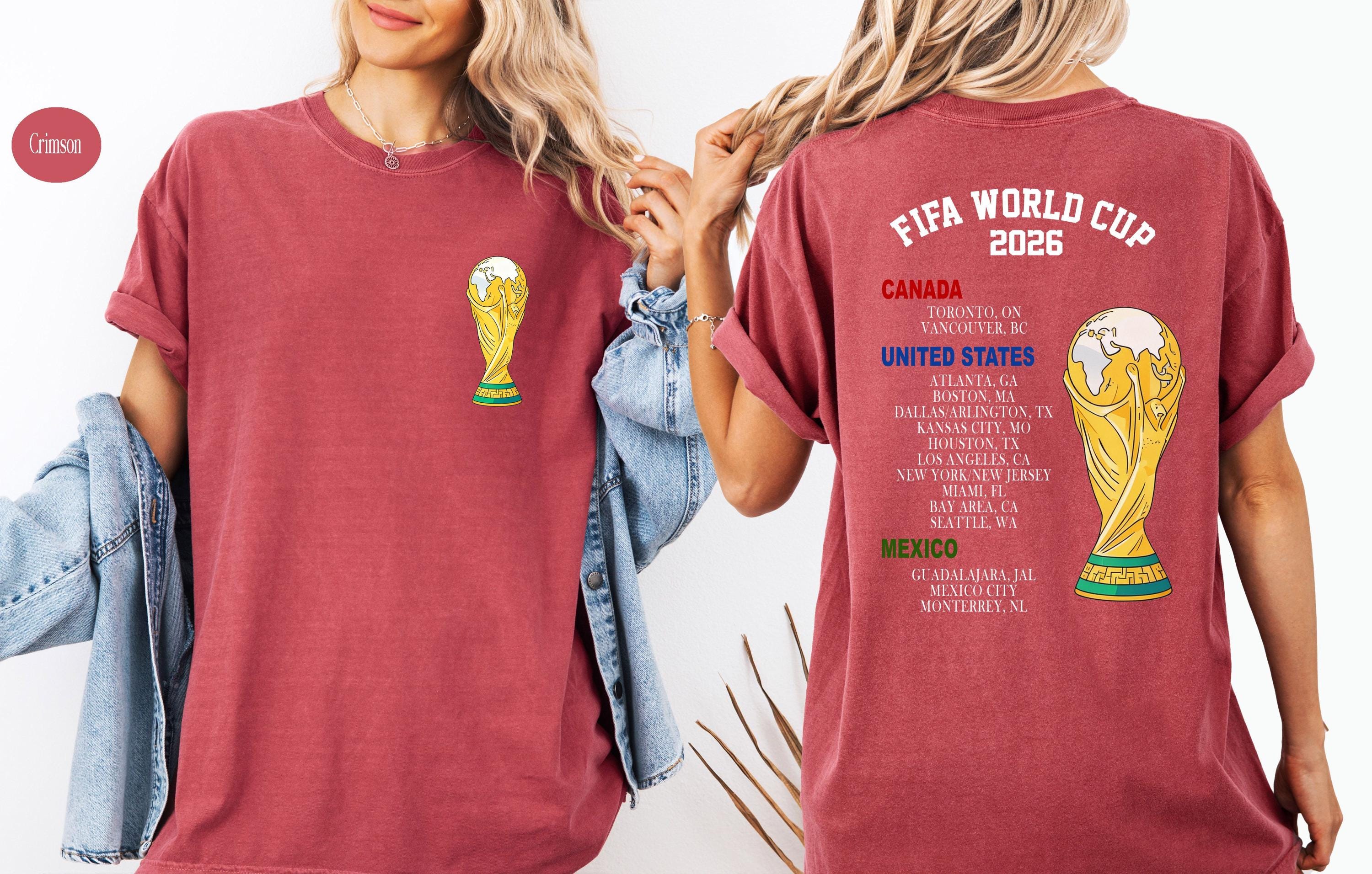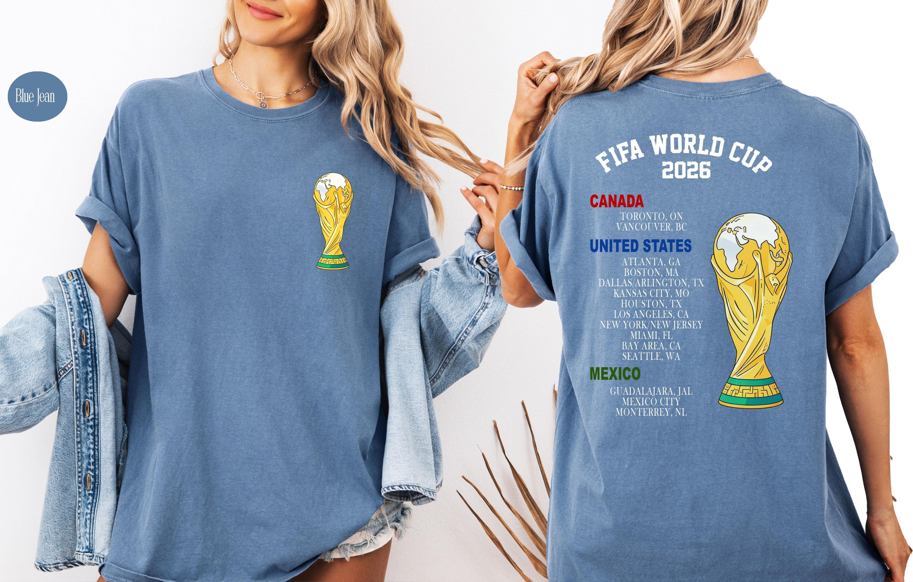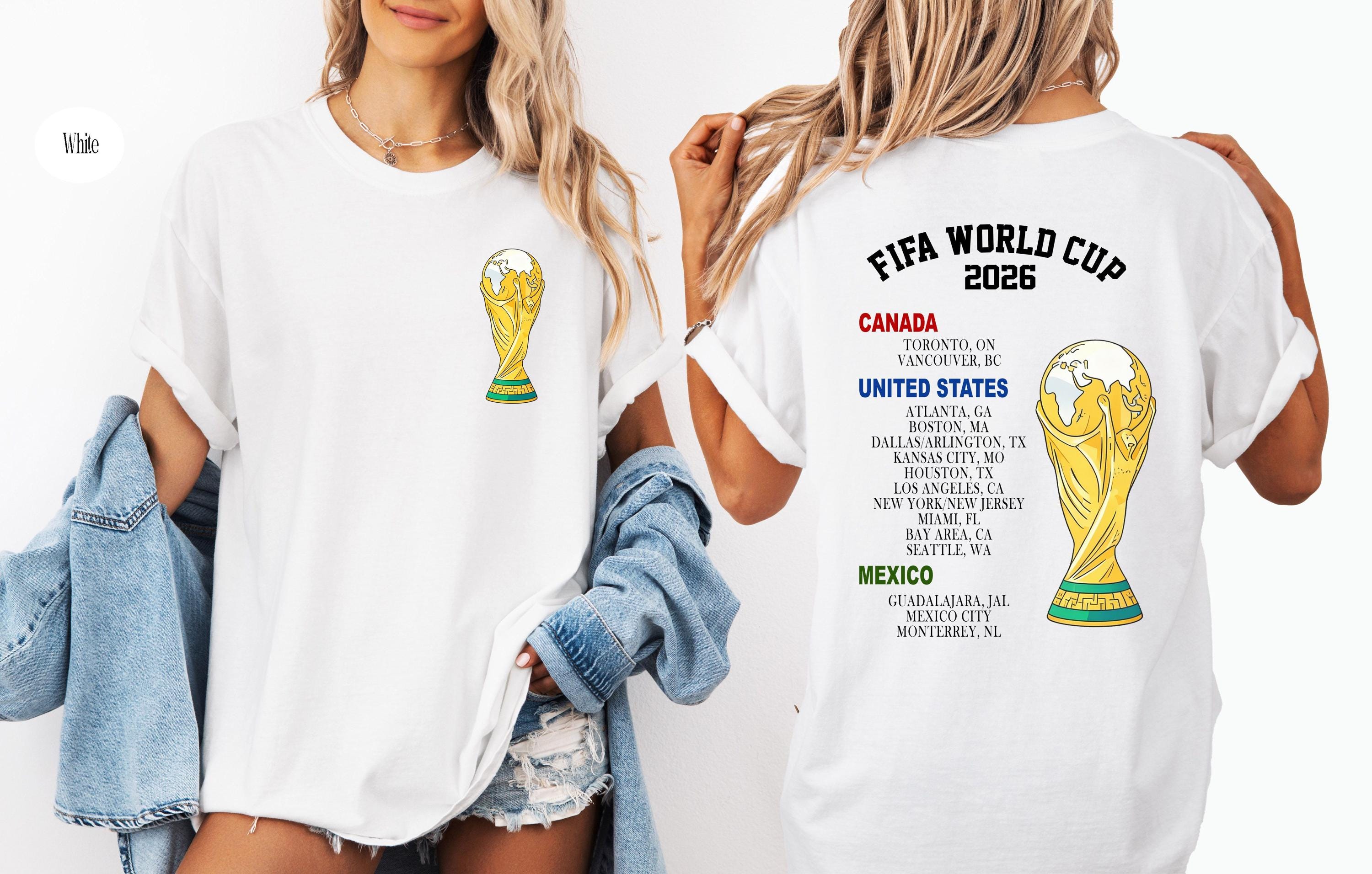 Celebrate the excitement of the World Cup 2026 with this stylish and meaningful soccer fan T-shirt! Designed for true football lovers, this tee features a bold World Cup–inspired trophy graphic on the front and a detailed list of host cities across the United States, Canada, and Mexico on the back.