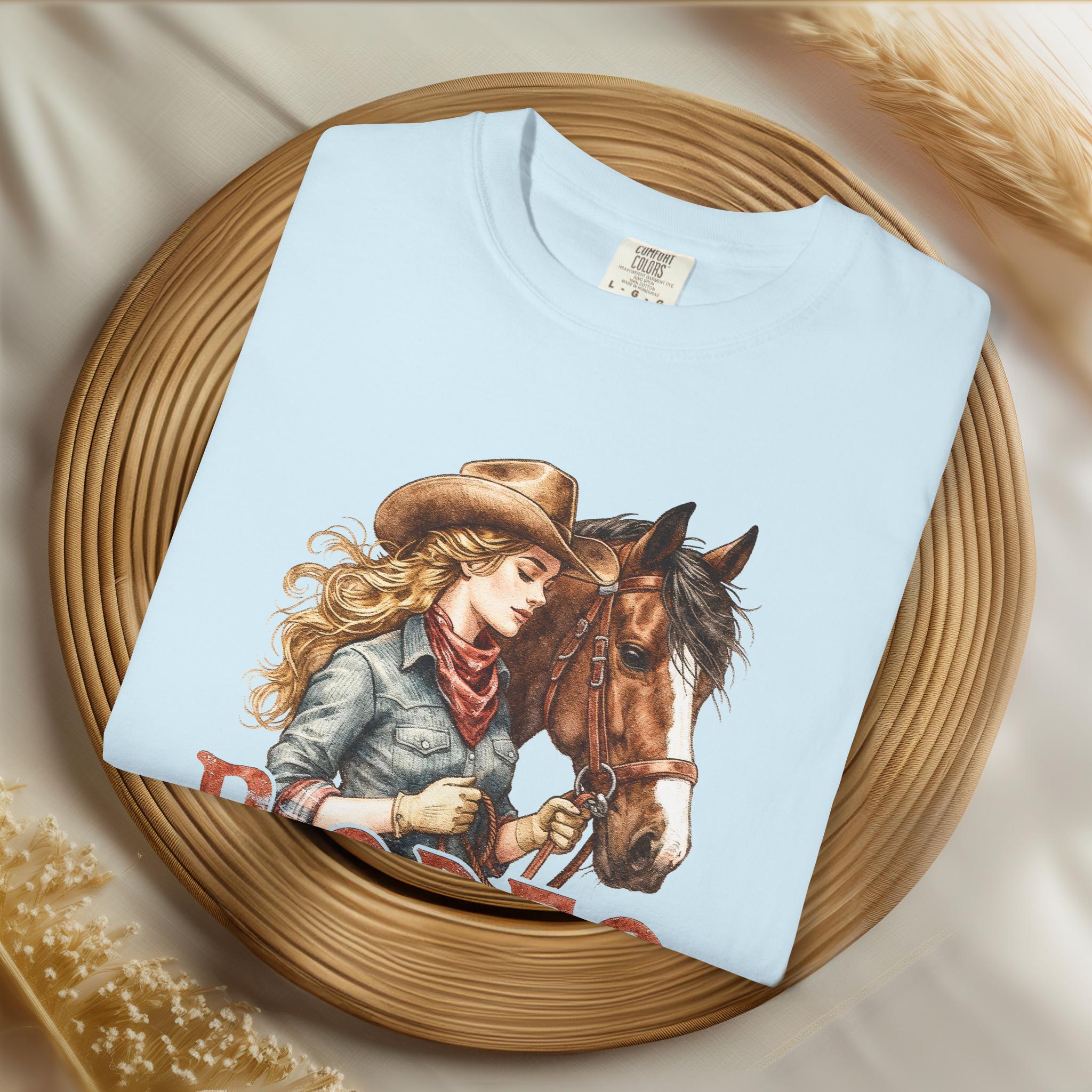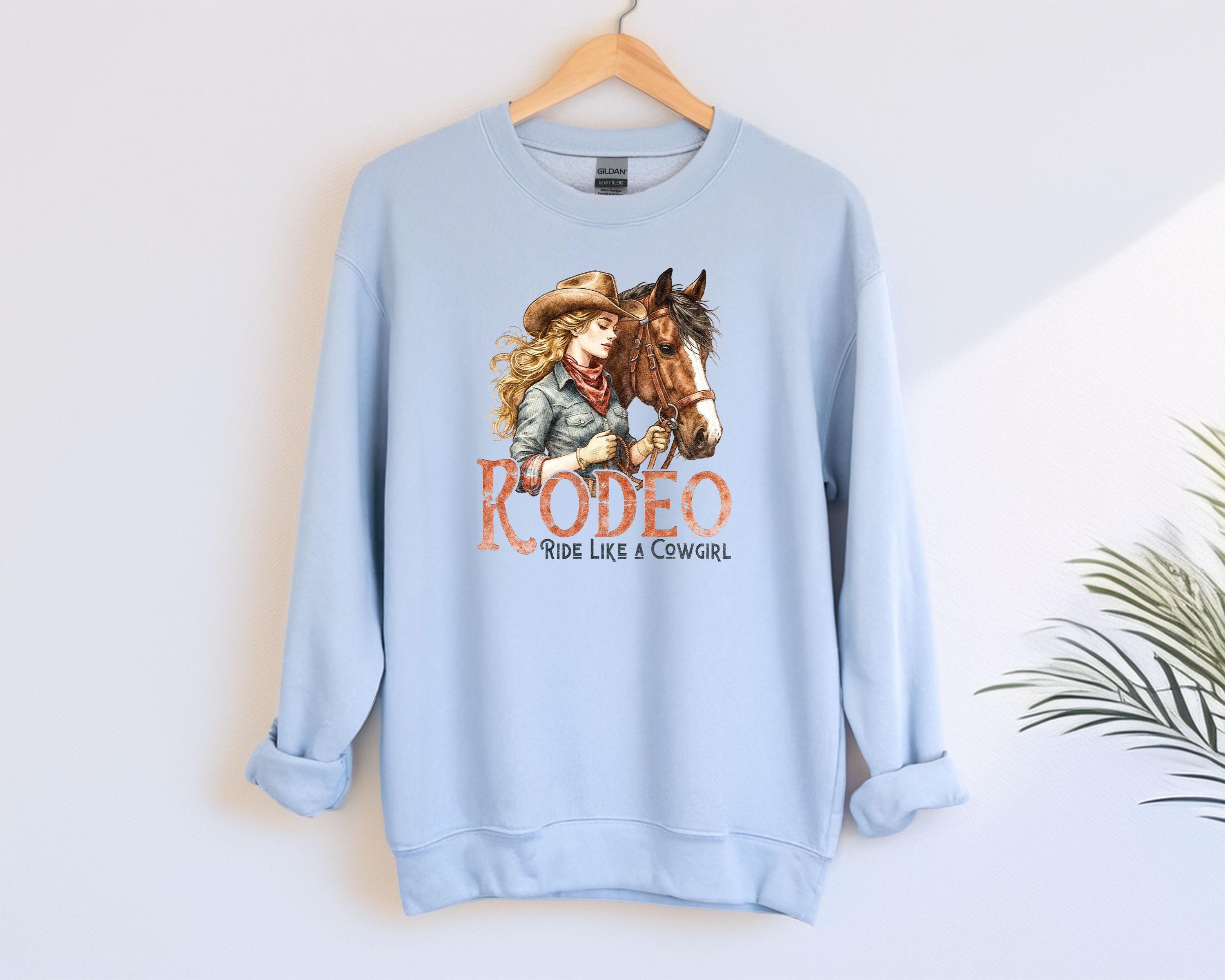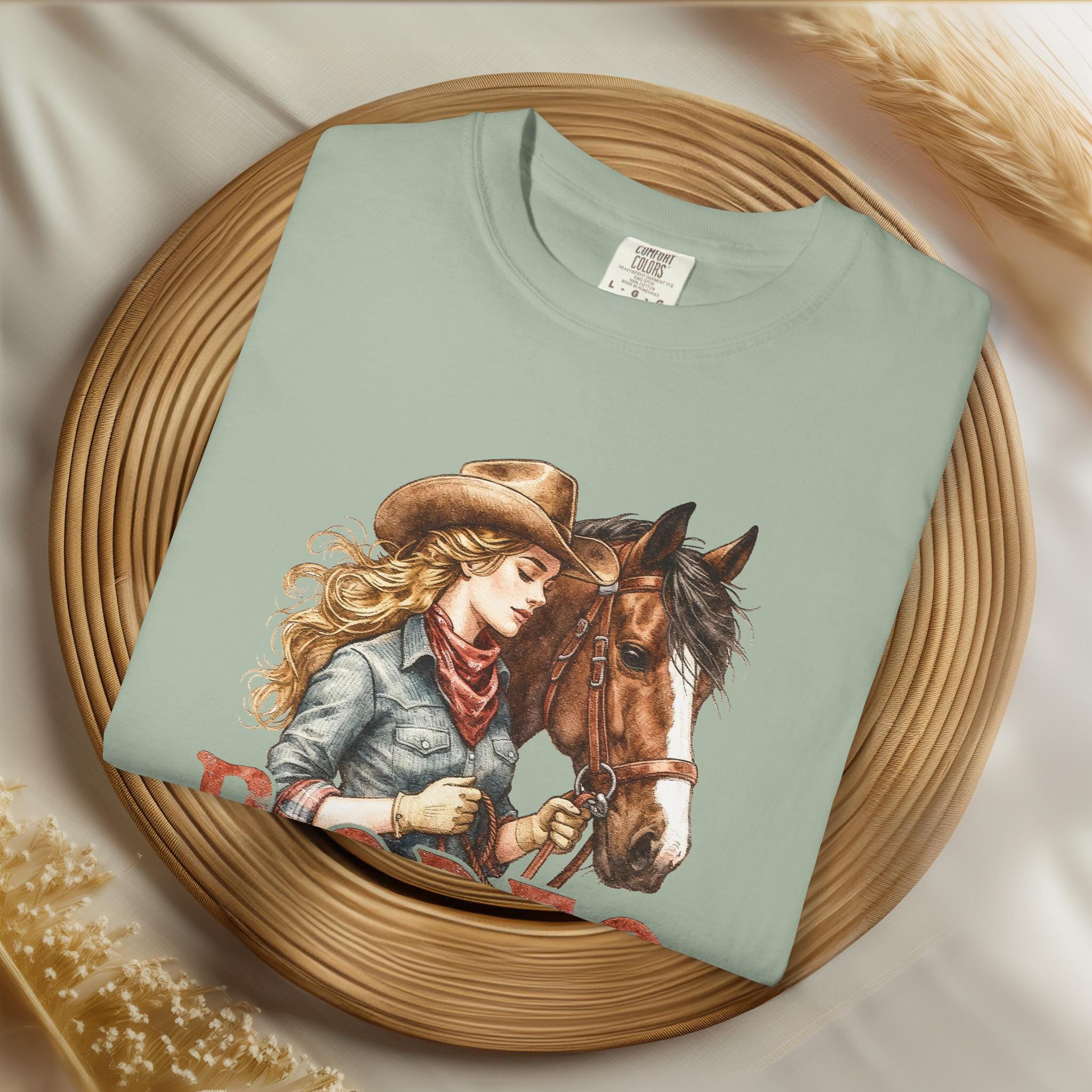 Channel your inner spirit of the west with our "Rodeo: Ride Like A Cowgirl" apparel. Featuring a beautifully detailed vintage-style illustration of a cowgirl and her horse, this design is perfect for horse lovers, rodeo fans, and anyone who lives for the country lifestyle. Whether you're heading to the ranch or just love the western aesthetic, this graphic is a timeless addition to your wardrobe.