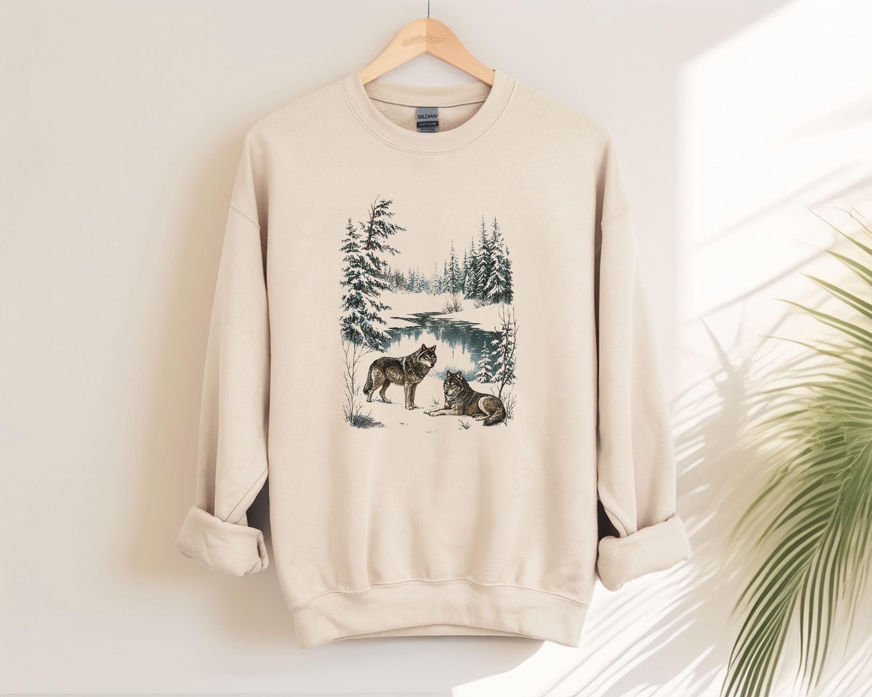 Immerse yourself in the quiet beauty of the wild with our "Winter Wolf Wilderness" apparel. This captivating design features a detailed, vintage-inspired illustration of a wolf pair amidst a serene, snow-covered forest and icy lake. It’s the perfect piece for nature lovers, wildlife enthusiasts, and those who feel at home in the great outdoors.