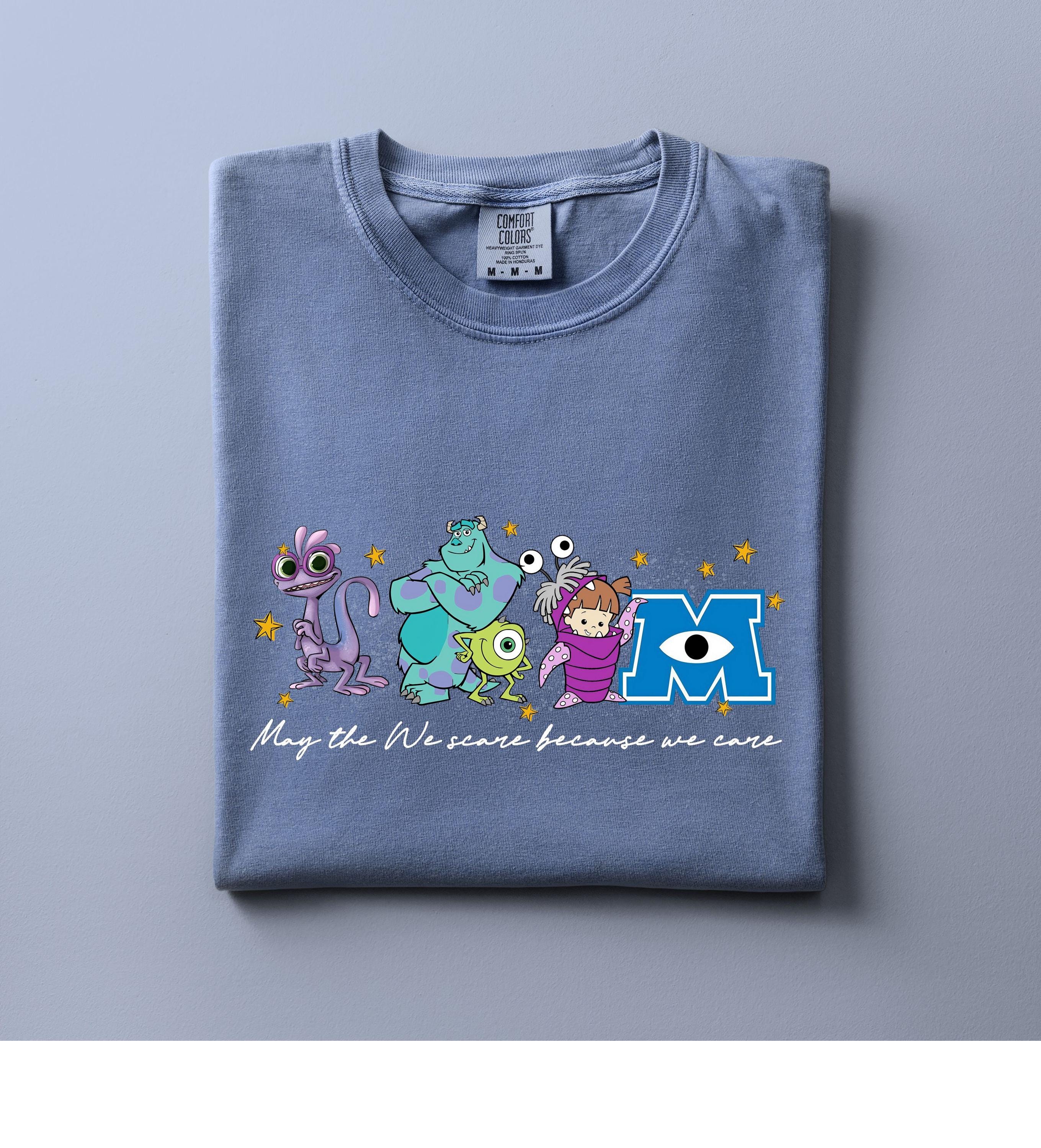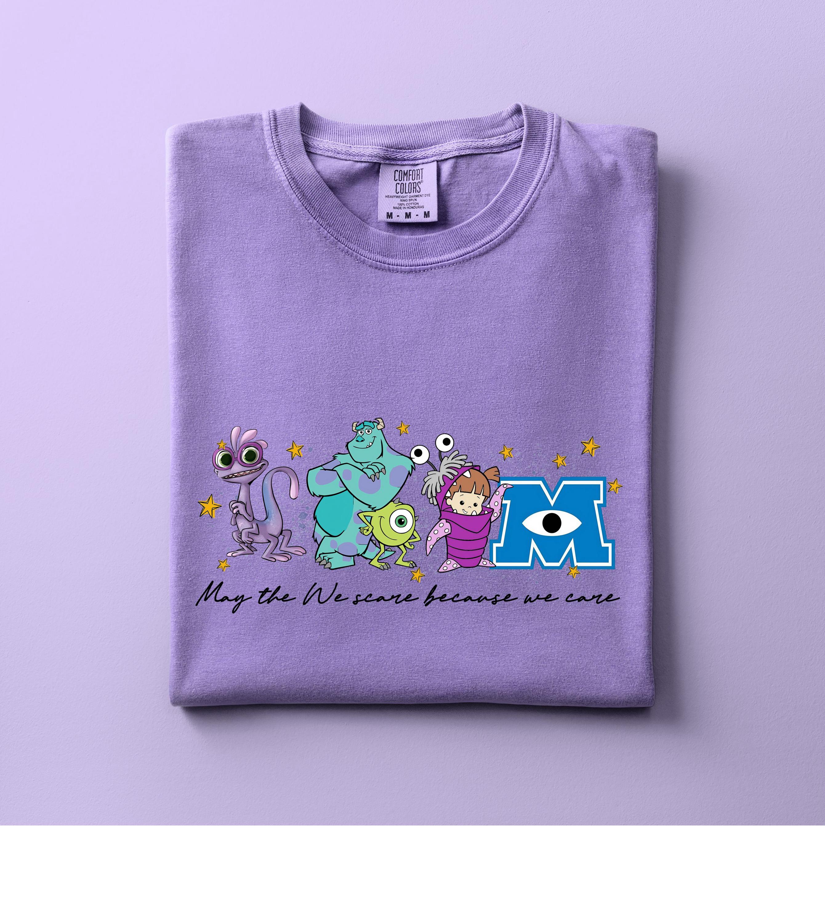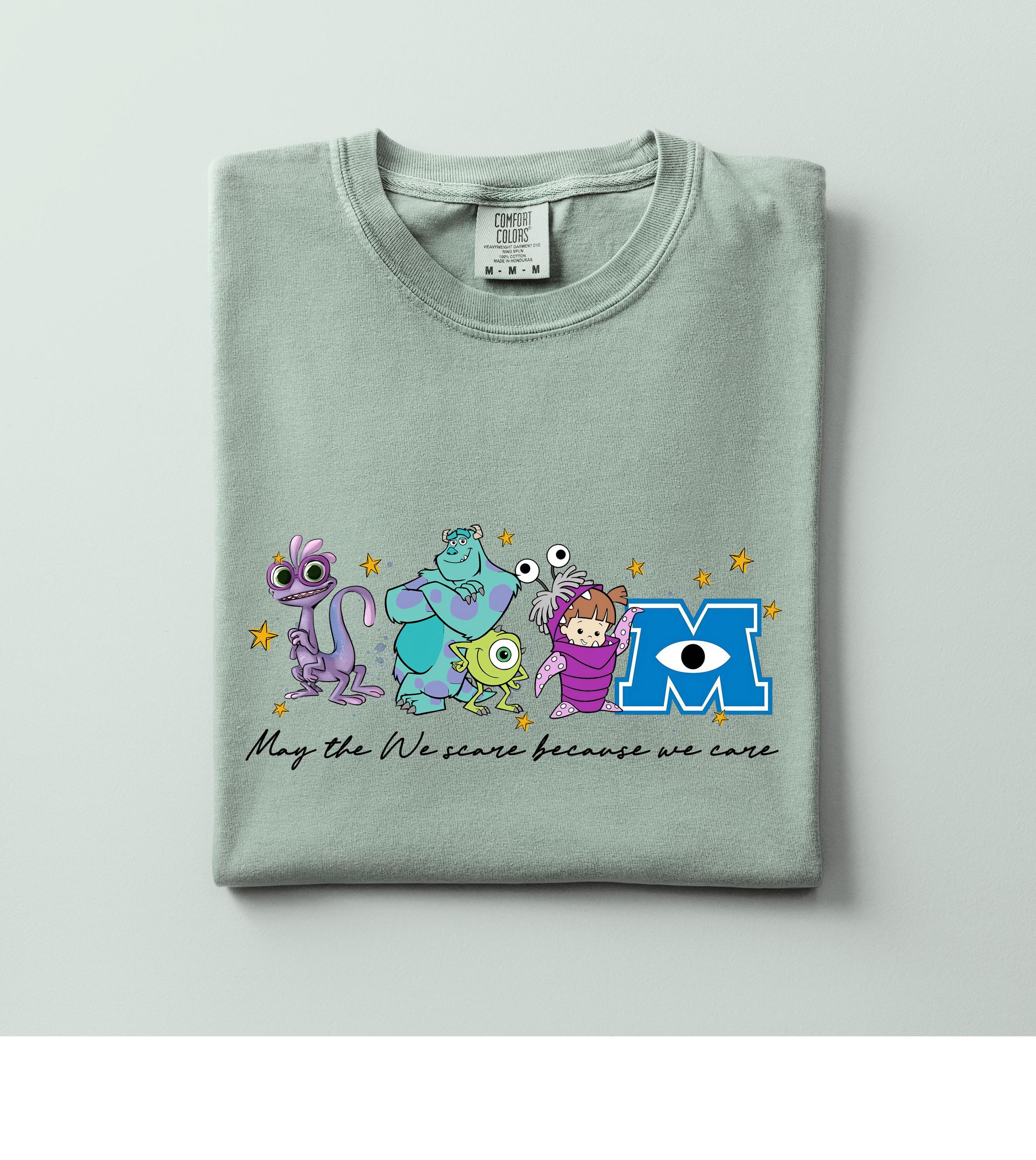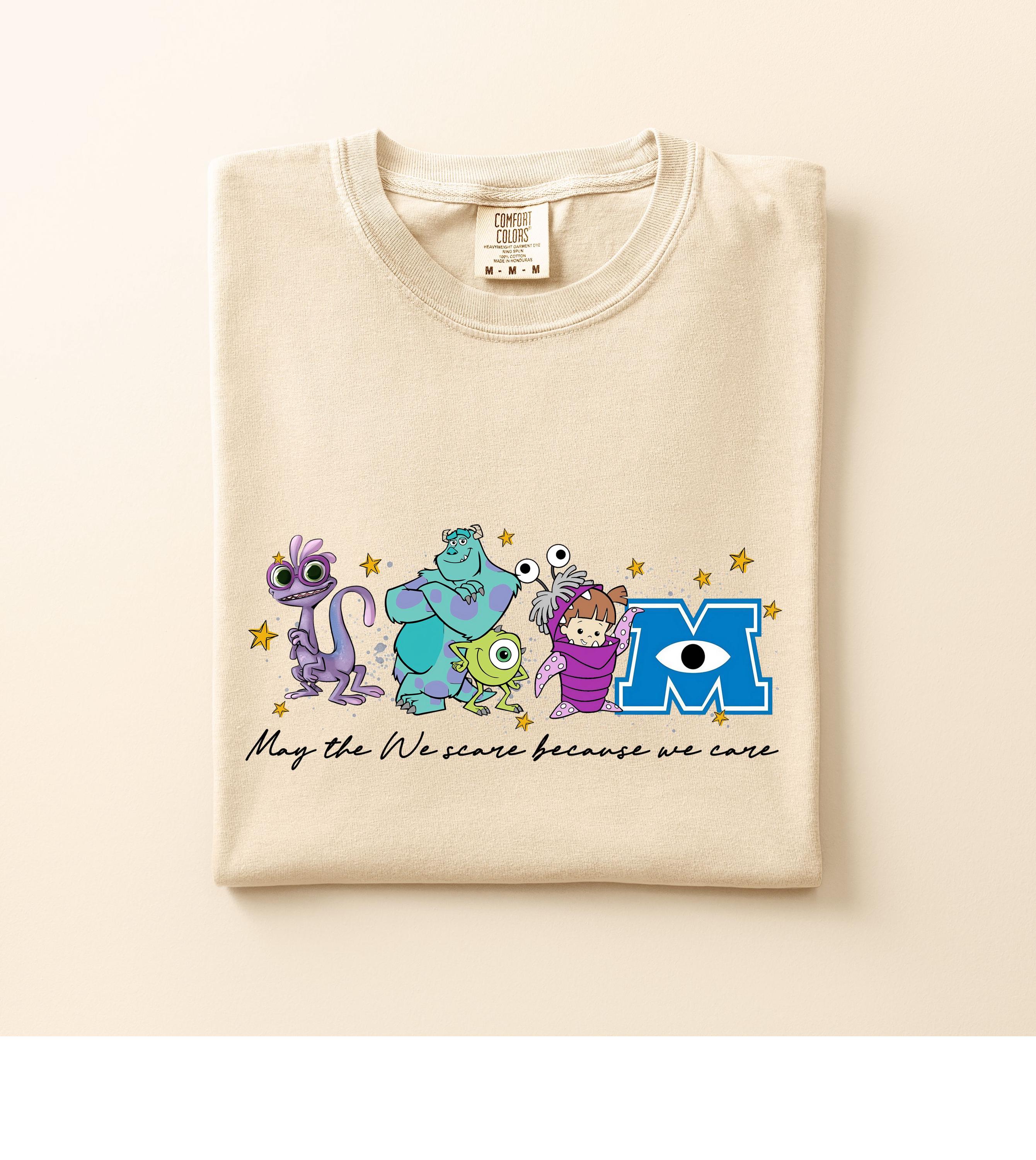 Featuring a row of colorful, whimsical monsters and a classic scaring company slogan, this shirt is designed for ultimate comfort and nostalgia. Whether you're heading on a family vacation to a famous theme park or just love the aesthetic of friendly monsters, this high-quality graphic tee is a perfect fit.