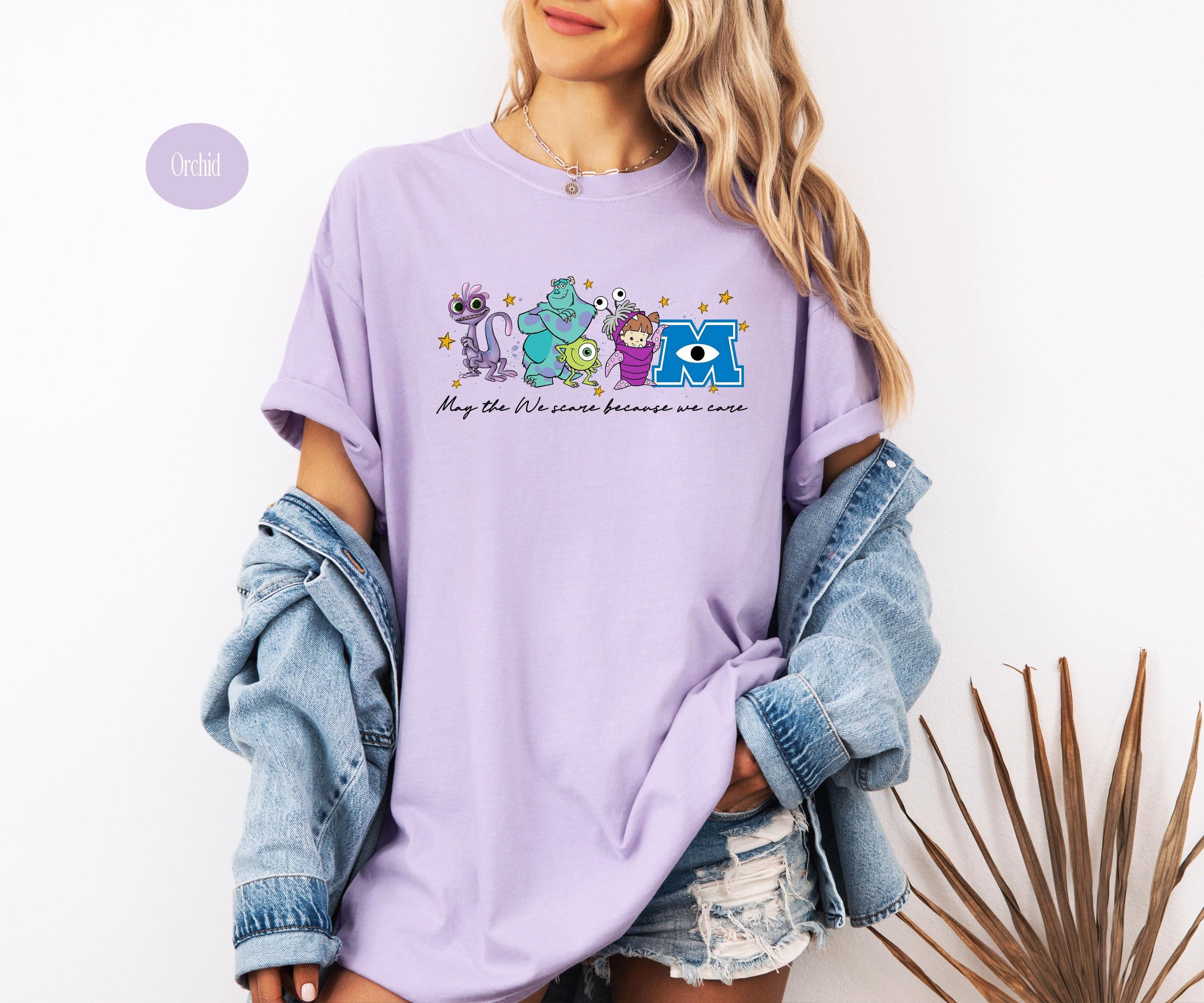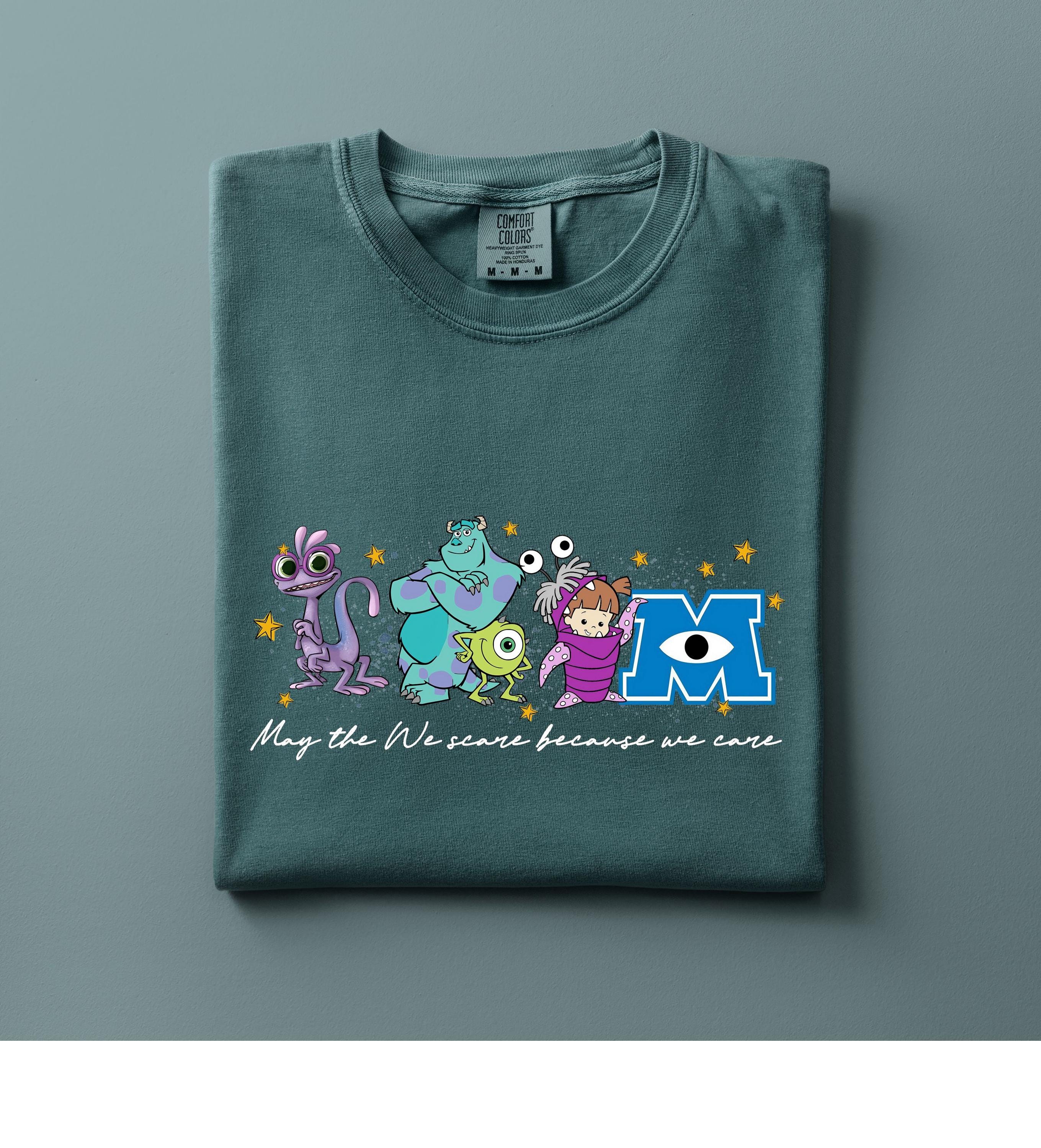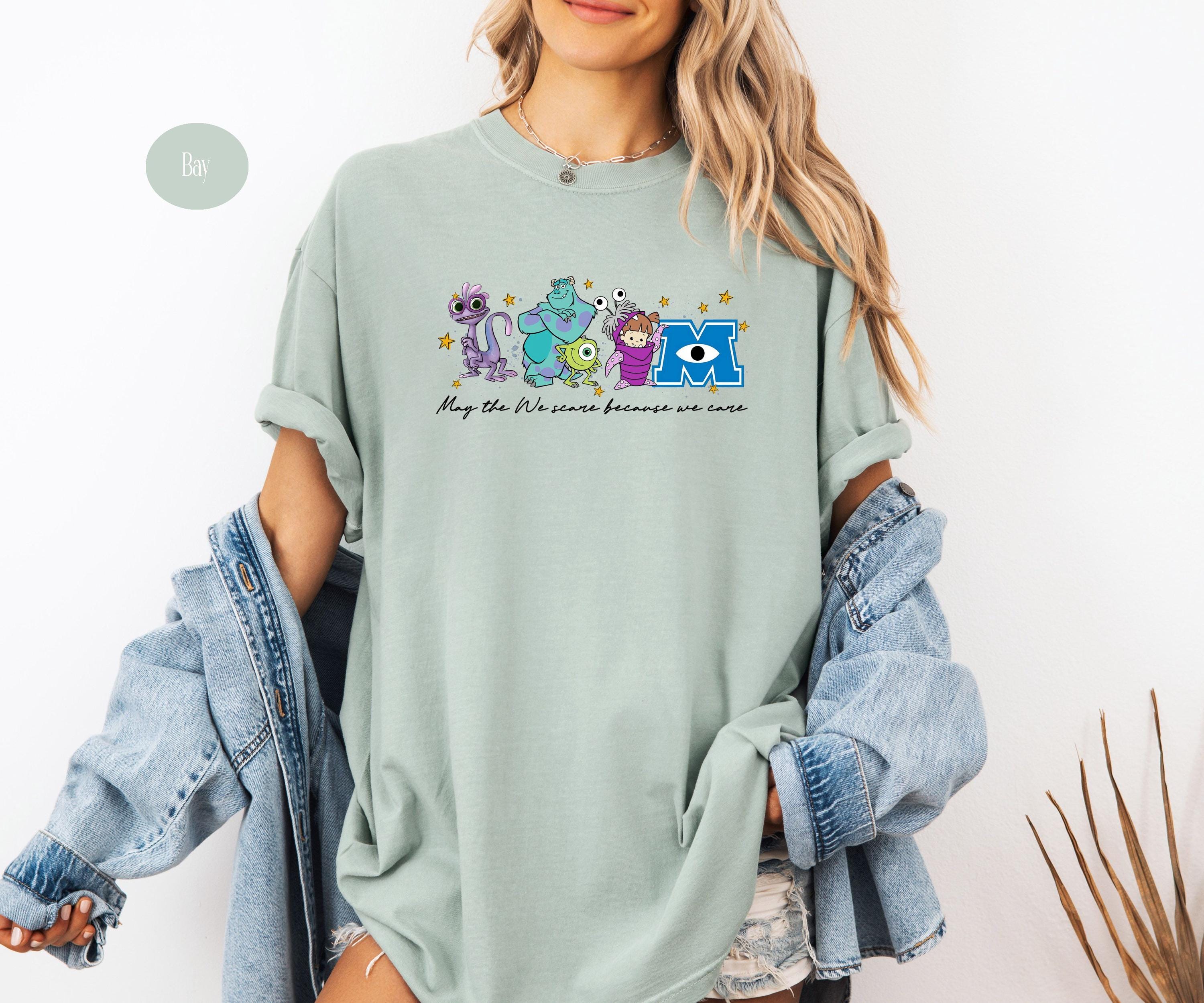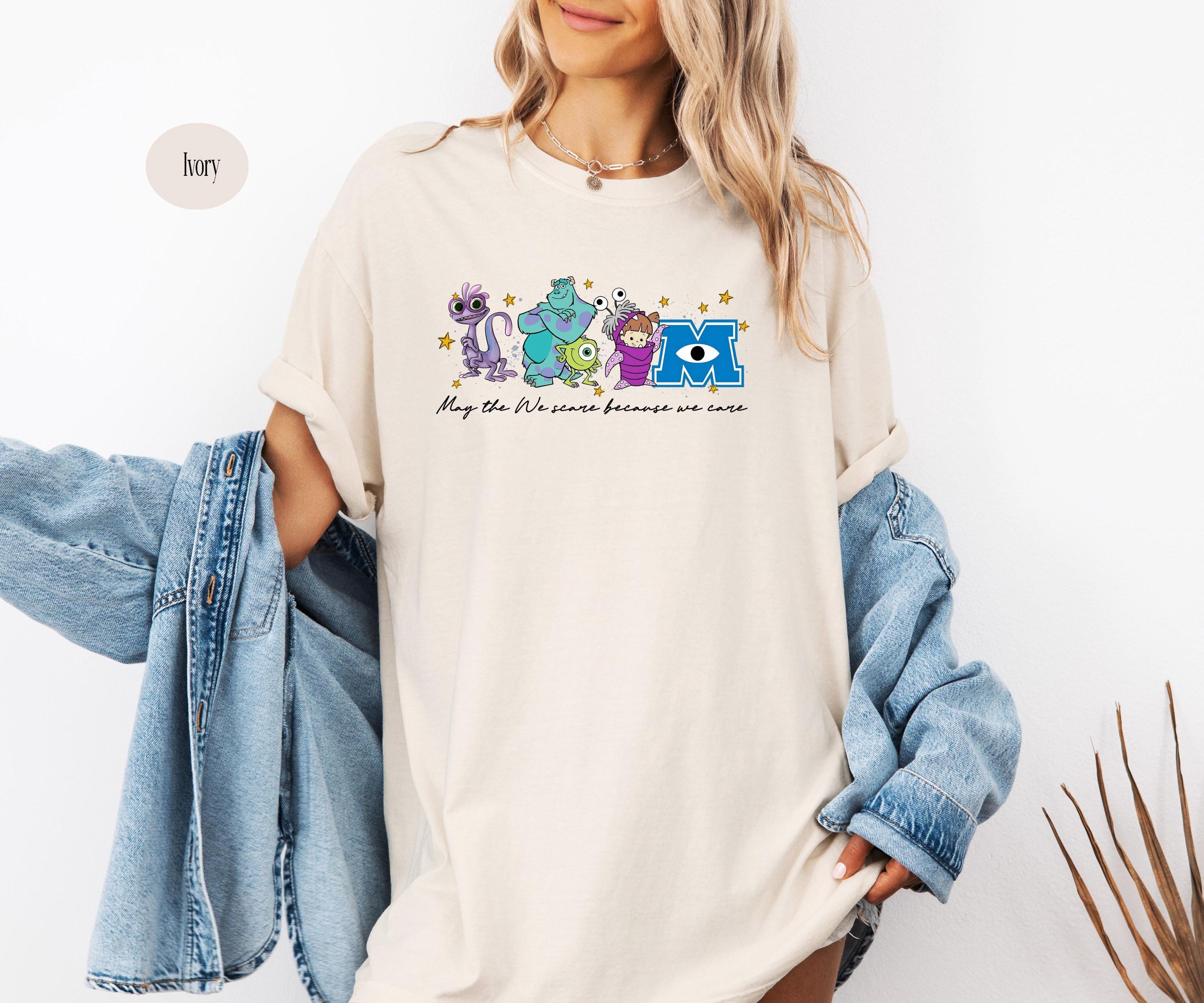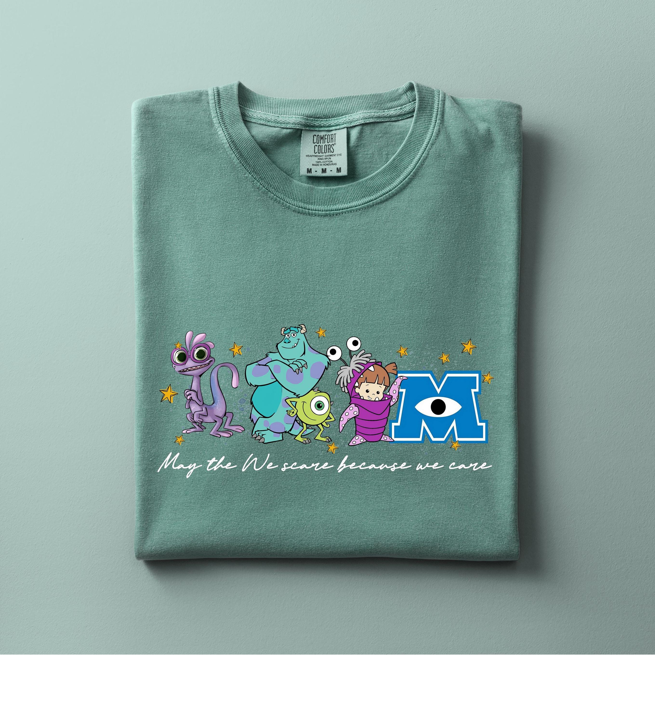 Featuring a row of colorful, whimsical monsters and a classic scaring company slogan, this shirt is designed for ultimate comfort and nostalgia. Whether you're heading on a family vacation to a famous theme park or just love the aesthetic of friendly monsters, this high-quality graphic tee is a perfect fit.