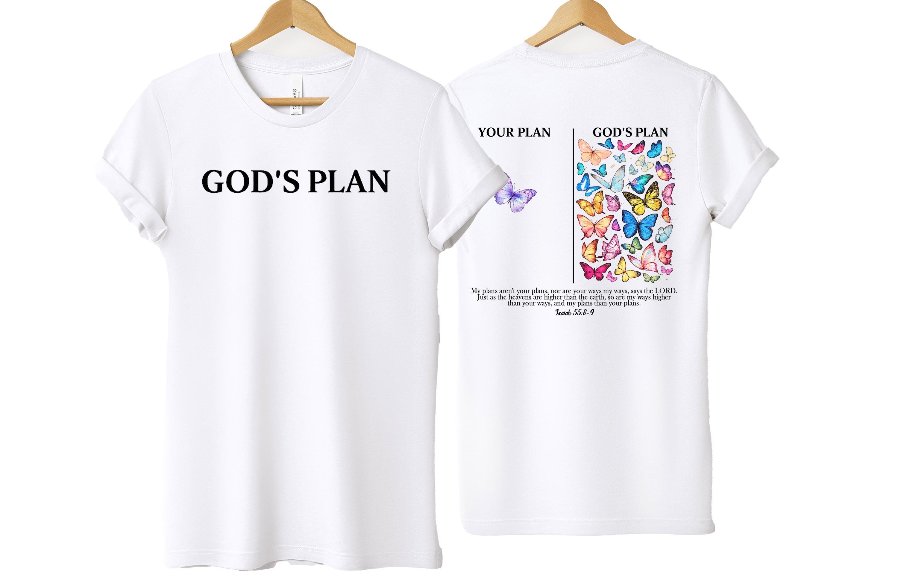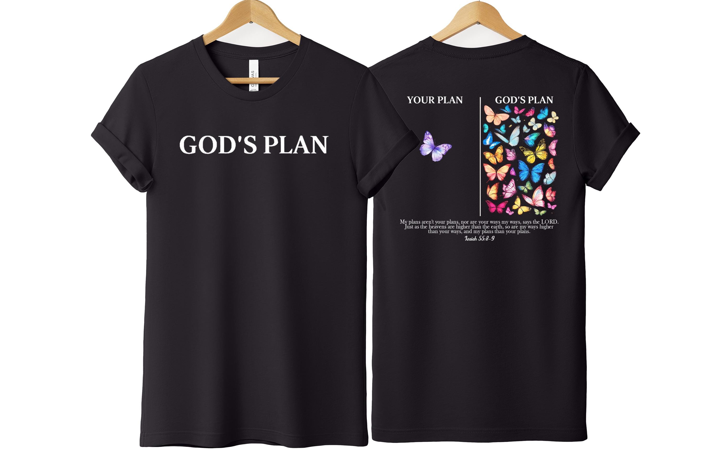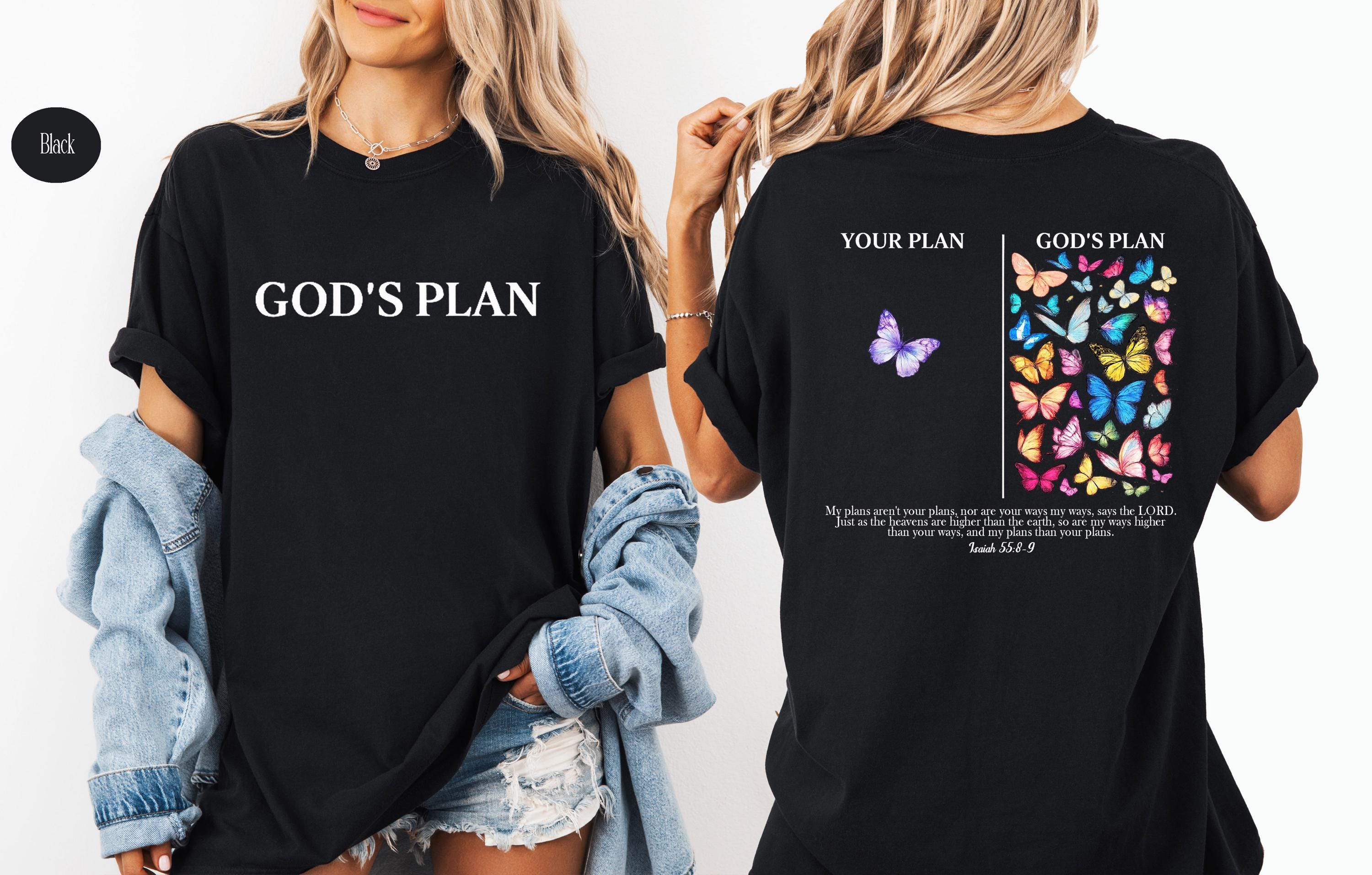 This inspirational Christian T-shirt is a beautiful reminder that God’s plan is always greater than ours. Featuring a minimalist front design with the words “God’s Plan” and a meaningful back illustration showing “Your Plan vs God’s Plan” with colorful butterflies, this shirt is inspired by Isaiah 55:8–9.
