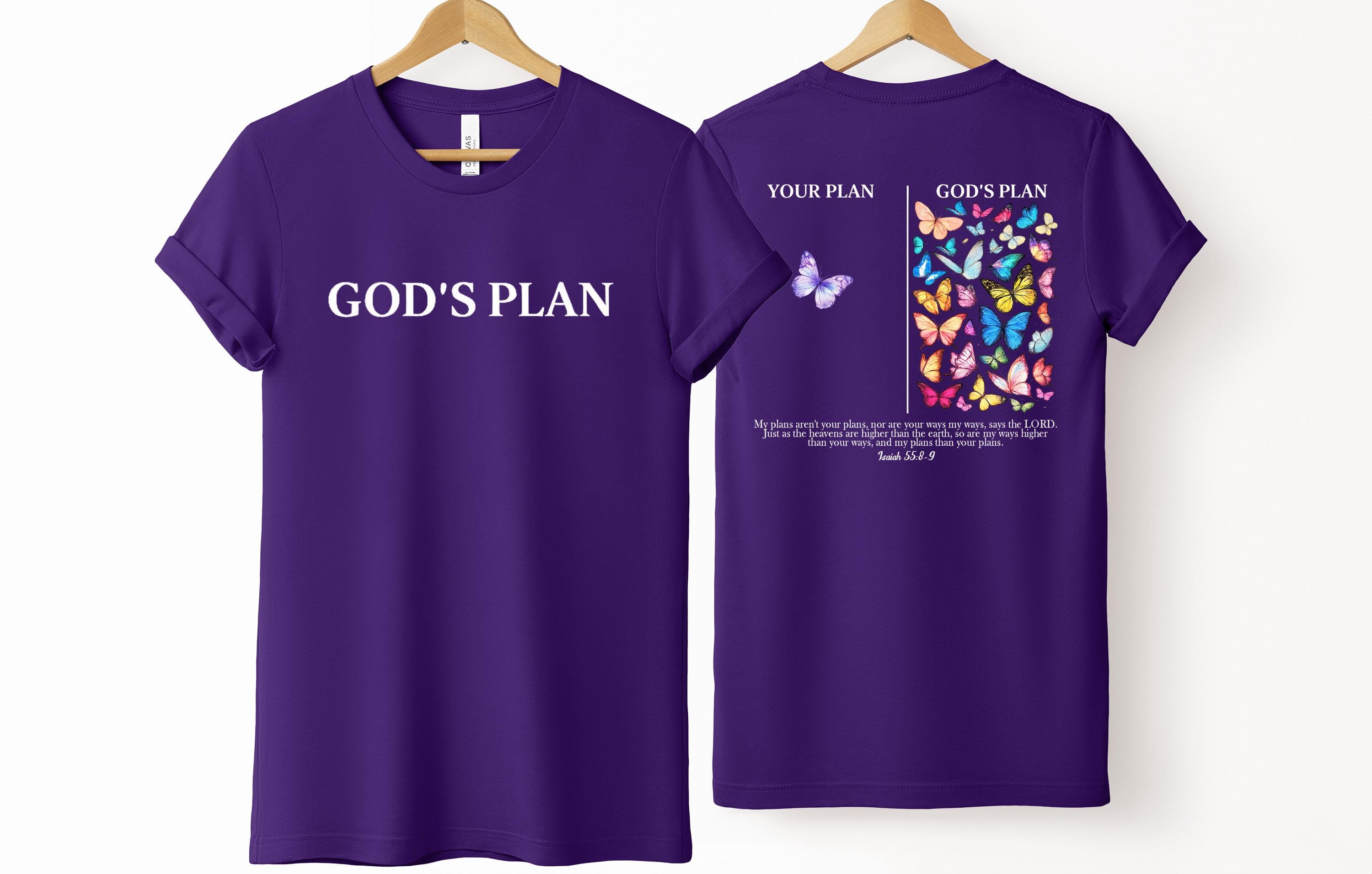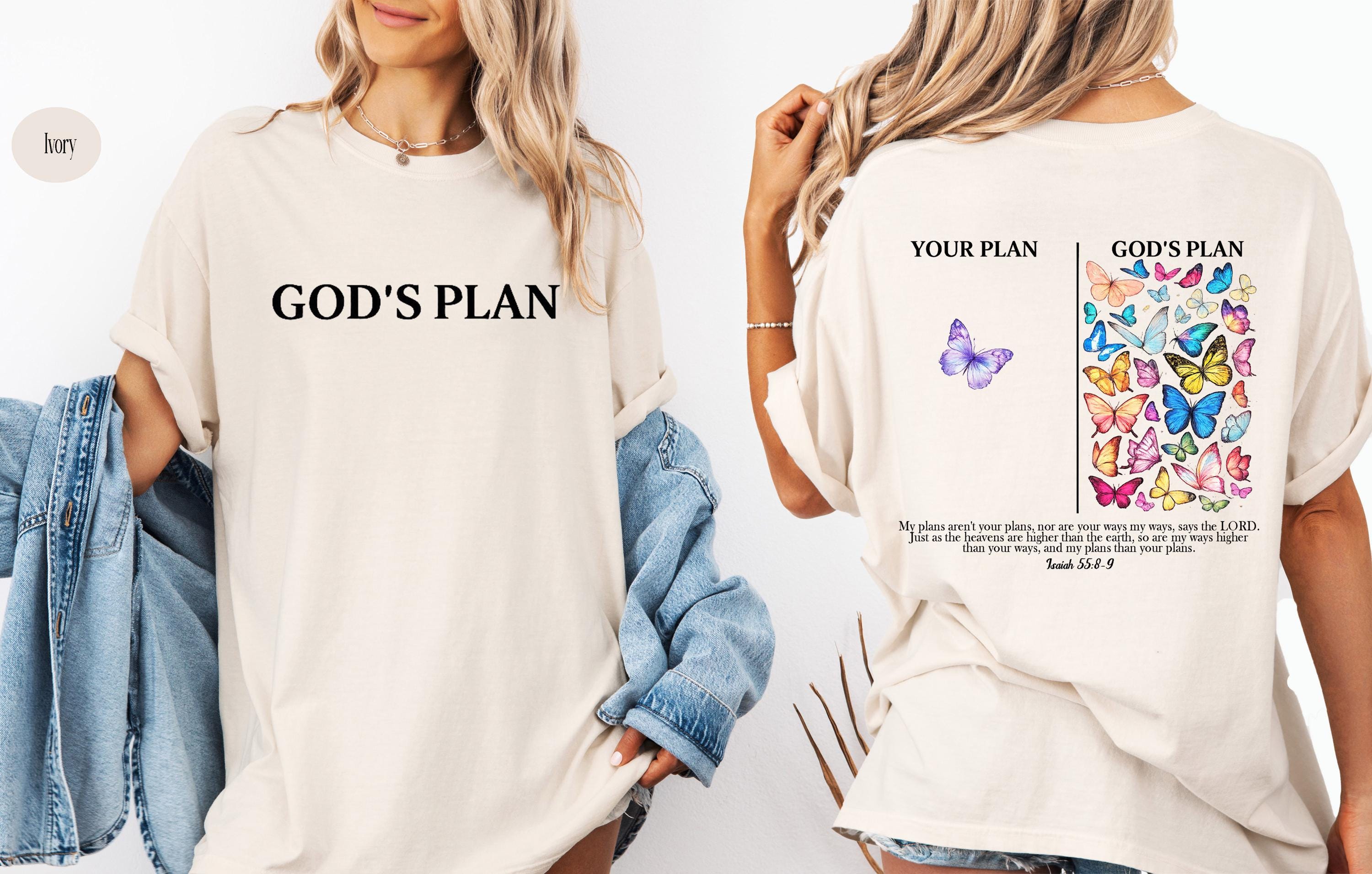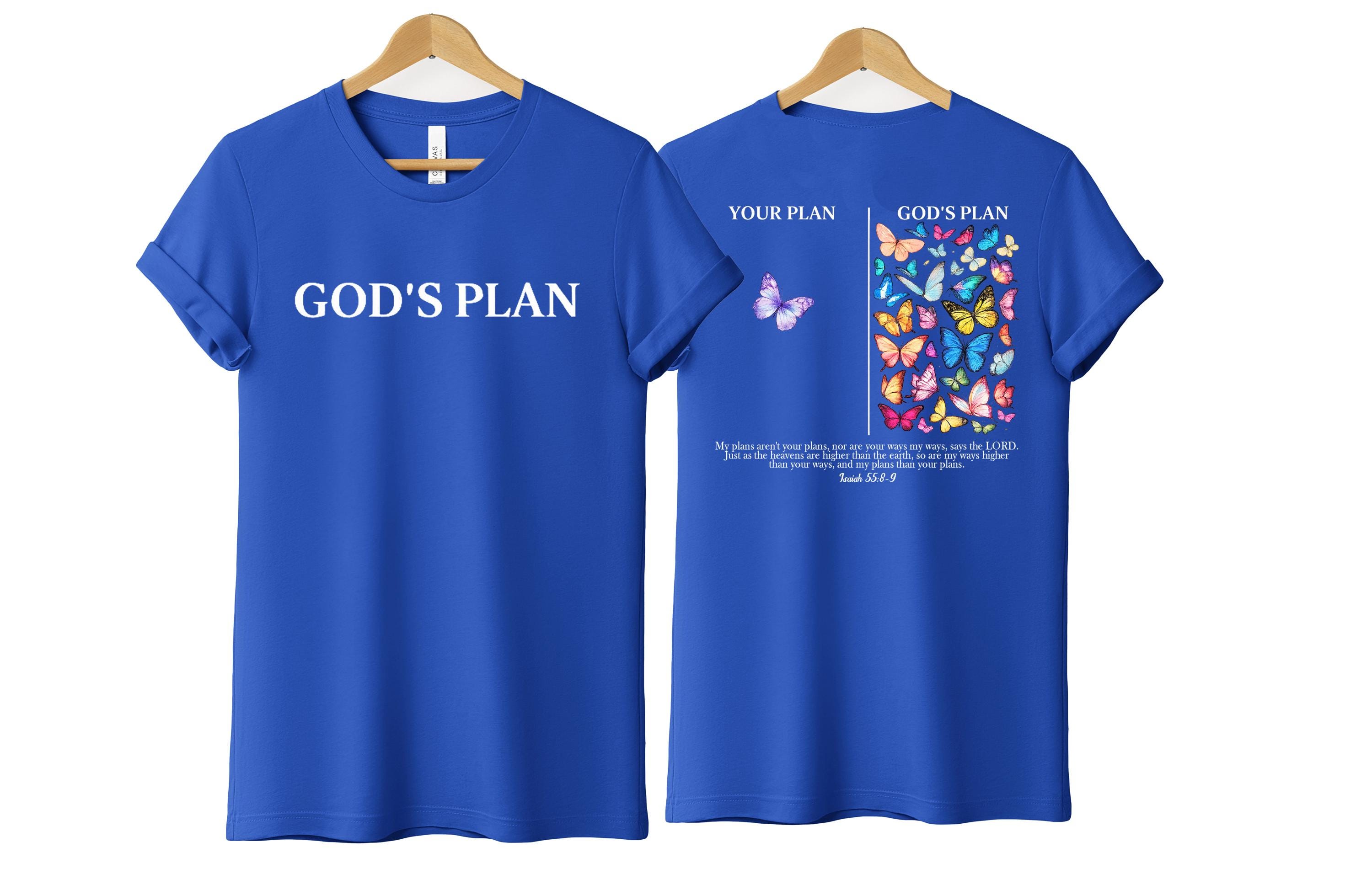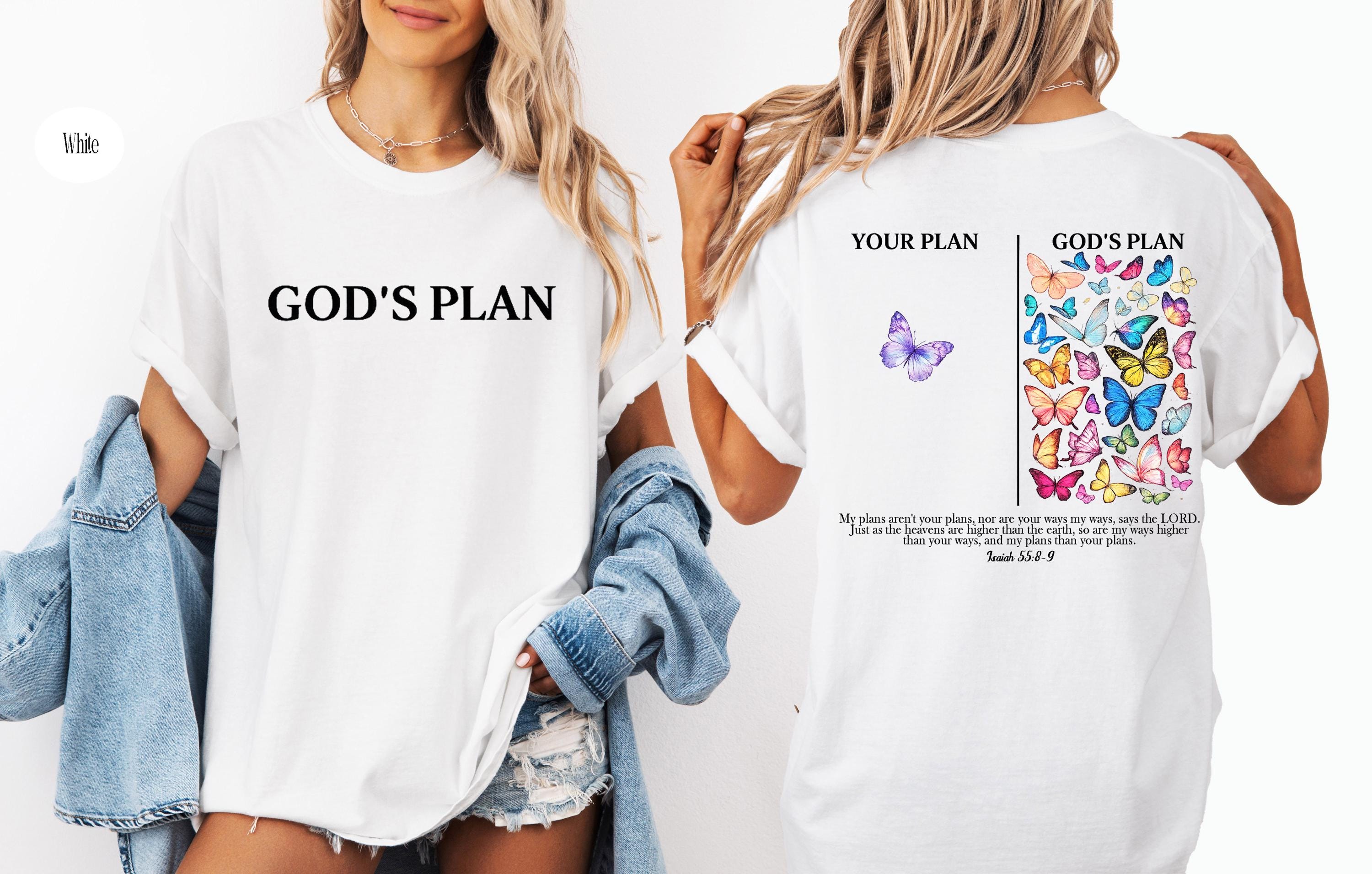 This inspirational Christian T-shirt is a beautiful reminder that God’s plan is always greater than ours. Featuring a minimalist front design with the words “God’s Plan” and a meaningful back illustration showing “Your Plan vs God’s Plan” with colorful butterflies, this shirt is inspired by Isaiah 55:8–9.